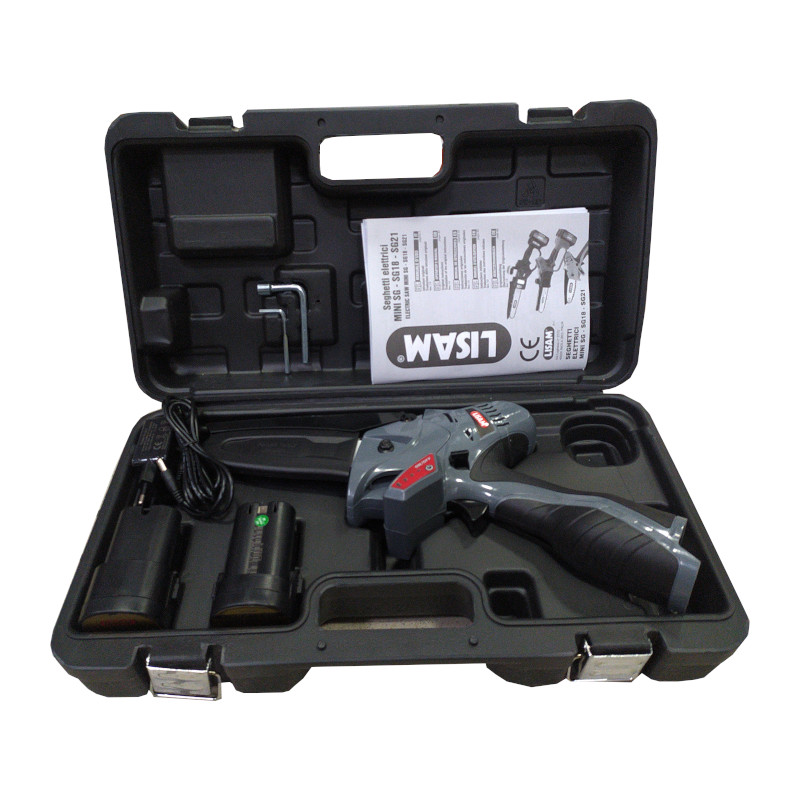 In dotazione, una comoda cassetta per trasportare il potatore, 2 batterie, un carica batteria(che ti permette di caricare contemporaneamente le batterie), chiavi per smontare la spranga di guida.